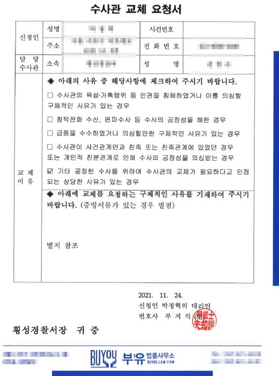 부유는 이대로 수사가 진행된다면 담당 수사관이 의뢰인의 억울한 사정을 전혀 귀담아 듣지 않을 것이라 판단, 의뢰인을 위해 담당 수사관의 교체를 신청하였고, 결국 수사관의 교체가 이루어 졌습니다.