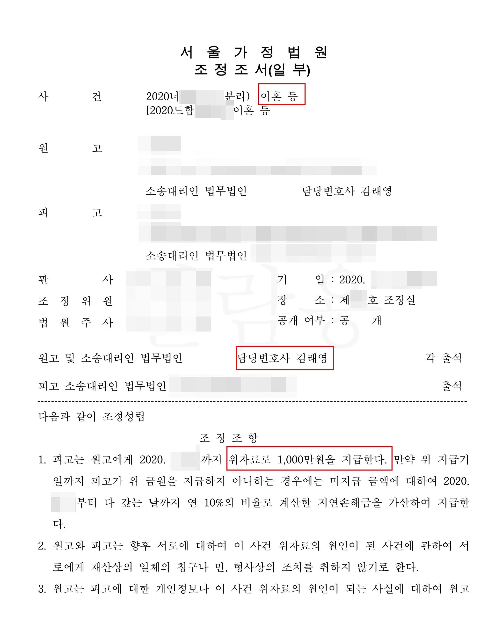 재판부는 본 변호인의 주장을 모두 받아들여 우선 상간녀에게 위자료 1,000만원을 지급하라는 판결을 내렸습니다. 특히 상간녀위자료청구소송은 불륜증거자료가 명확해 조정으로 원만히 마무리가 되었습니다.