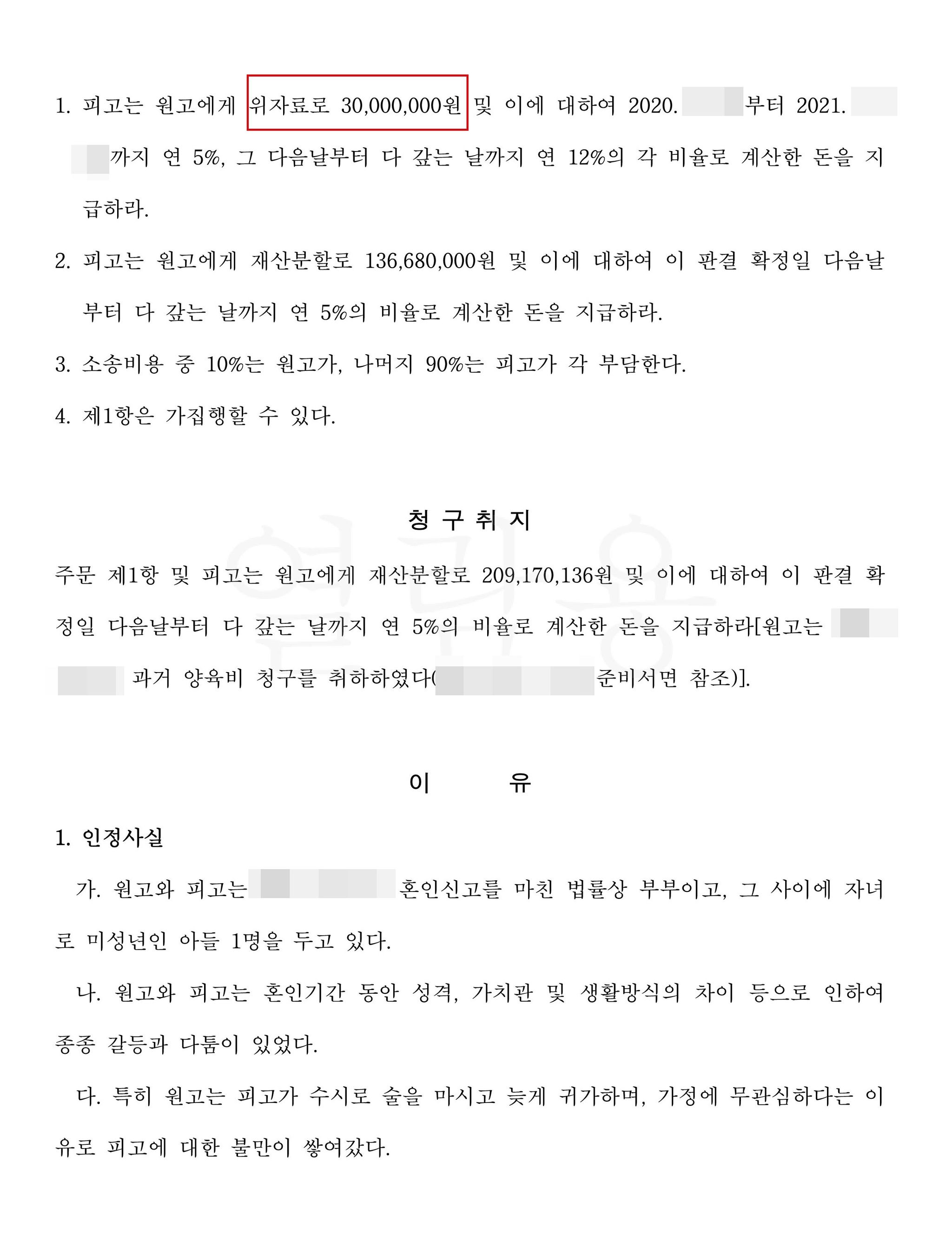 더불어 남편인 피고를 상대로 한 이혼소송과 위자료청구소송도 법원은 의뢰인의 손을 들어주었습니다. 남편인 피고의 부정행위가 명백하게 민법 제840조의 재판상 이혼사유에 해당돼 혼인파탄의 책임이 남편에게 있다고 보았습니다.