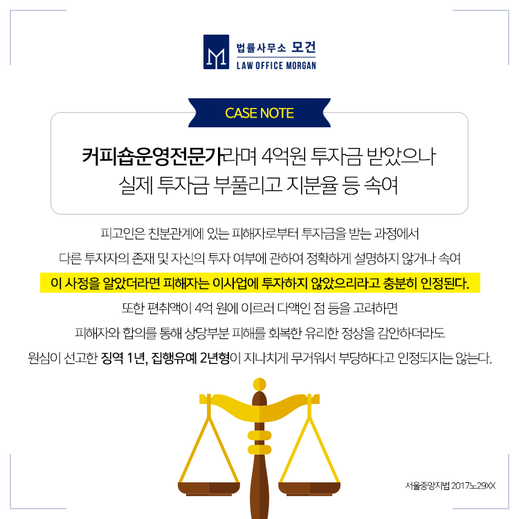 법률사무소 모건의 이다슬 대표변호사는 형사전문변호사로서 실제 대여금 편취 등 사기혐의를 받은 의뢰인의 사건을 맡아 보석허가결정 및 집행유예의 성공적인 결과를 이끌어 낸 사례를 보유하고 있습니다. 또한 투자금 사기죄는 형사고소뿐만 아니라 민사상소송까지 책임을 져야 할 수 있으므로 사건 초기부터 종로/강서/마포 사기죄변호사의 전방위적인 도움이 필수입니다. 관련 사건에 상담이 필요하신 분들은 법률사무소 모건으로 문의주시기 바랍니다.
