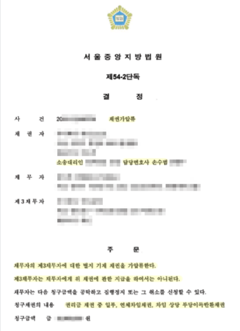 채무자는 본인 소유의 부동산이 없었고 유일한 재산으로 알고 있는 채권에 대하여 부동산변호사 손수범 변호사는 채권가압류 결정을 받아 채무자가 채권을 처분할 수 없도록 하였습니다.