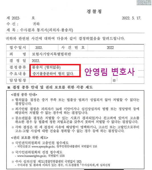관할 경찰서는 안영림 변호사가 제출한 증거자료 및 변호인의견서를 인정하여 최종적으로 의뢰인(피의자)에 대하여 혐의없음을 이유로 불송치 결정하였습니다.
