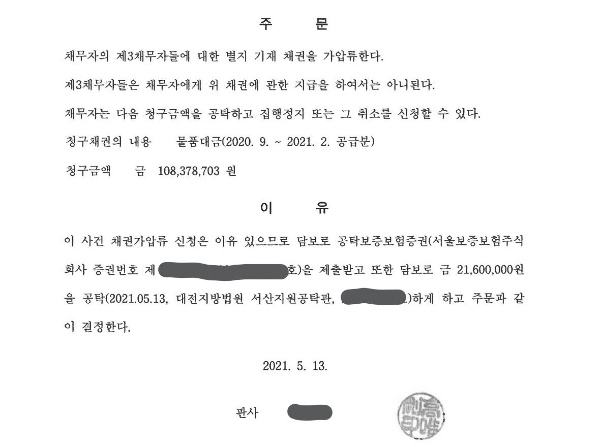 주영재 변호사는 집행권원을 얻기 위해 즉시 지급명령을 신청하는 한편, 강제집행 할 재산을 보전하기 위해서 채무자가 제3채무자에 대해 가지고 있는 금전채권에 관하여 가압류를 신청하였습니다.