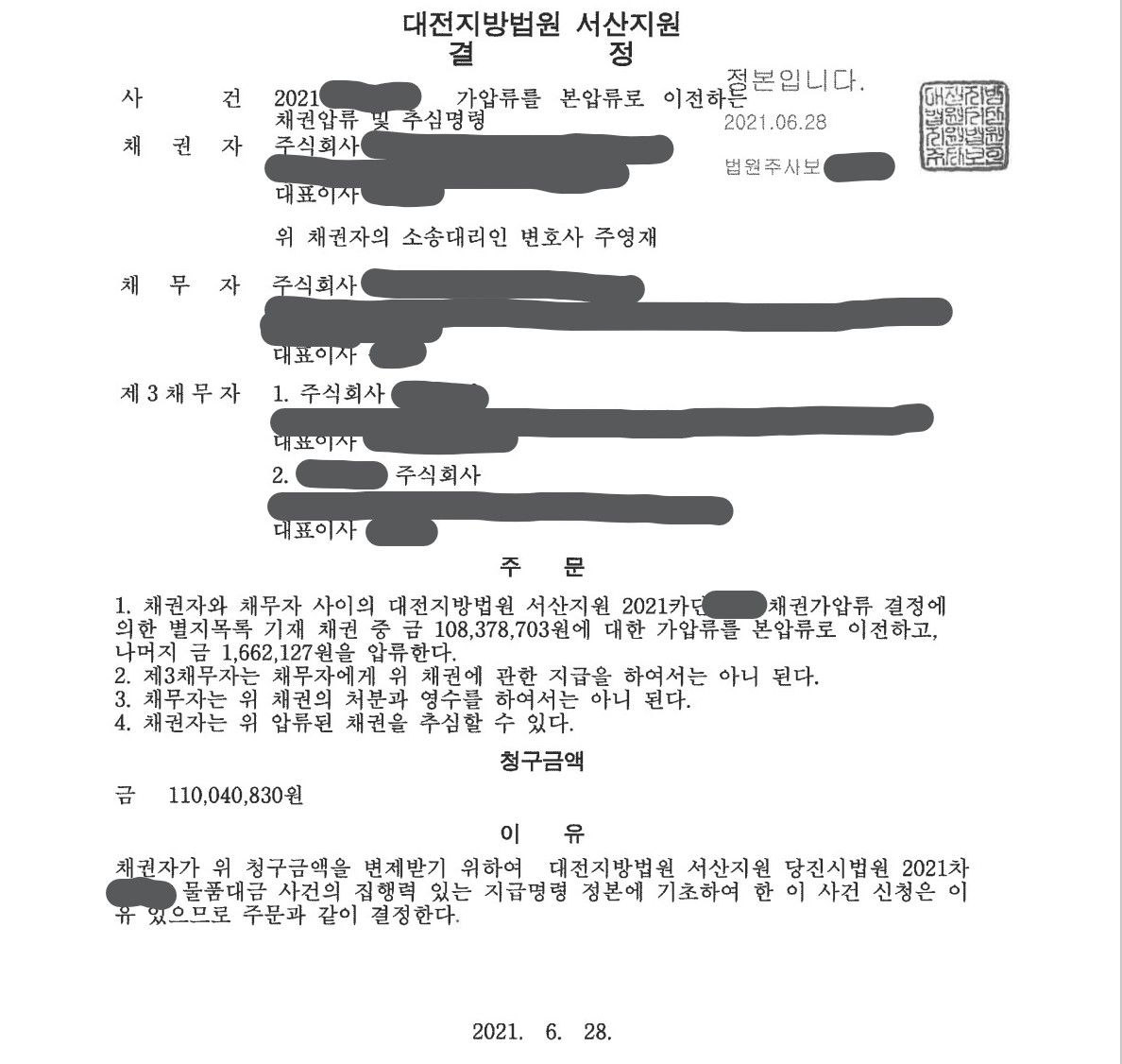 법원은 주영재 변호사가 제출한 증거가 명확했기에 곧바로 지급명령 및 가압류를 인용하는 결정을 내렸고, 채무자가 이의신청을 포기하여 위 지급명령이 확정됐습니다.