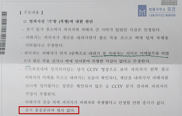 고소인은 피의자가 고소인이 '계단을 내려가면서 팔로 목을 조르고 벽에 밀쳐 폭행했다'고 주장했으나, CCTV 확인 결과 피의자가 피해자의 어깨를 팔로 감싸고 내려가는 장면만이 있을 뿐, 폭행 장면은 없었습니다. 또한 피의자는 '피해자가 먼저 잘 지내보자는 의미로 어깨동무를 하였다'는 주장과 CCTV분석 결과가 부합됨에 따라 경찰조사 단계에서 혐의를 벗을 수 있었습니다.