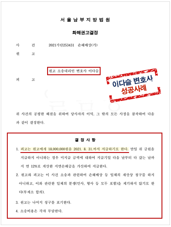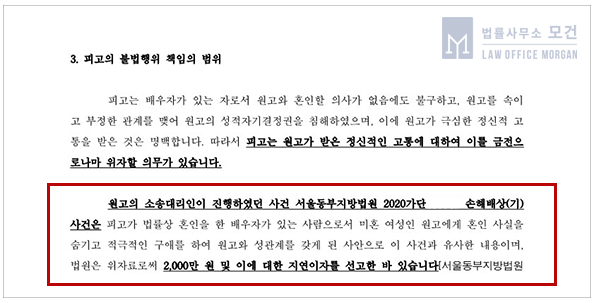 또한 이다슬 변호사의 성공사례들은 다수의 성공사례를 통해 축적된 노하우를 비롯해, 치밀한 입증증거를 바탕으로 상대방의 기망행위를 밝혀내고, 이로 인한 의뢰인의 정신적 고통과 피해를 적극 호소함에 따라 모두 1천만원 이상의 높은 위자료를 인정받고 있는 것도 주목할만한 부분입니다.