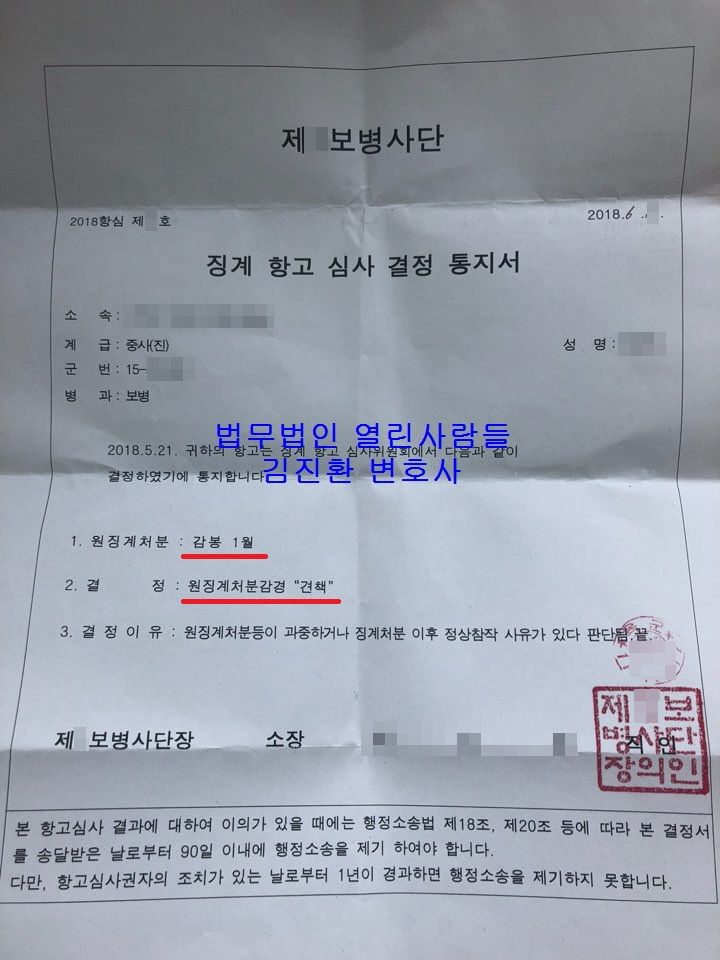이번에는 징계항고심 중 품위유지의무위반(영내폭행)으로 감봉 1월을 받아 항고한 사건을 소개하려 합니다.