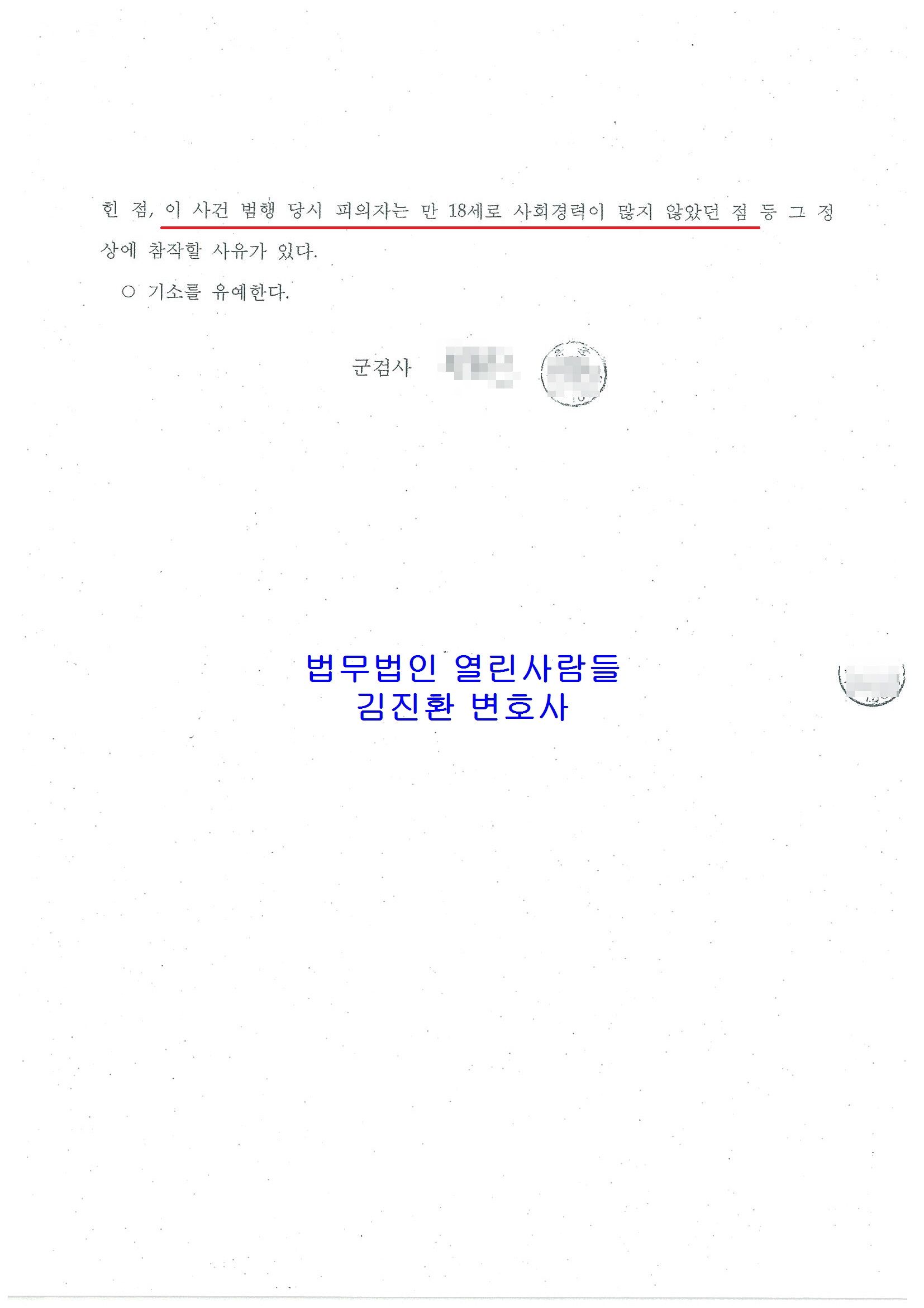 결국은 군검사님이 피해금액이 1억원이 넘어 컸음에도 나이가 어리고 합의하였으며 주도적인 역할을 하지는 않았음을 고려하여 전부 기소유예를 하는 선처를 해 주셨습니다.