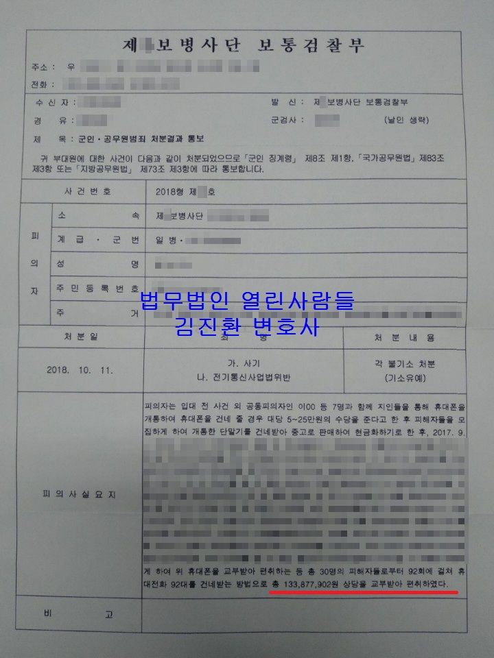 이번 성공사례는 군입대 전 사기와 전기통신사업법위반으로 조사를 받다가 입대를 한 병사의 사건인데요