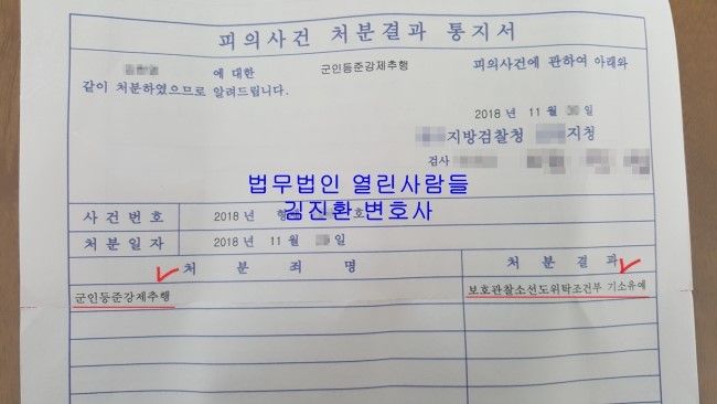 이번에 소개해 드릴 성공사례는 '군인등강제추행' 혐의로 형사입건되어 수사를 받던 병사가 전역 후 민간검찰에서 '교육이수조건부기소유예' 처분을 받은 사례인데요