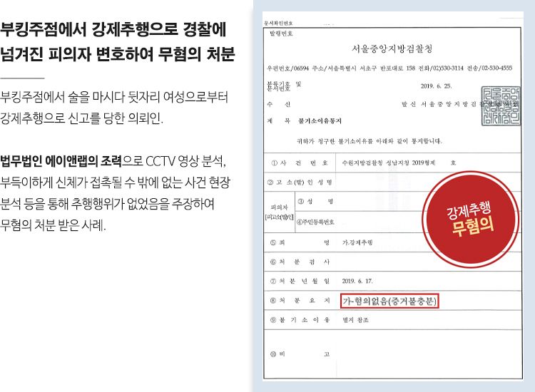 이에 법무법인 에이앤랩은 “의자에 등받이가 없어서, 술에 취한 의뢰인이 흥에 겨워 동작을 크게 취하거나 술기운을 못 이겨 몸을 뒤로 젖히면서 의도치 않게 상대방의 등에 신체의 일부가 닿은 사실은 있으나, 상대방이 주장하는 추행 행위는 없었다”는 내용의 변호인의견서를 제출하였고, 해당 내용을 담당 검사에게 충분히 설명하였습니다.