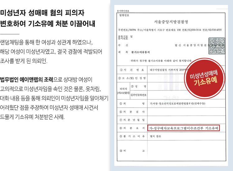 ![[성범죄] 미성년자 성매매 혐의 피의자 기소유예 처분](/_next/image?url=https%3A%2F%2Fd2ai3ajp99ywjy.cloudfront.net%2Fuploads%2Ftitleimage%2Foriginal%2F5b3a1404691ba3ae5ce93fa3-original.jpg&w=3840&q=75)