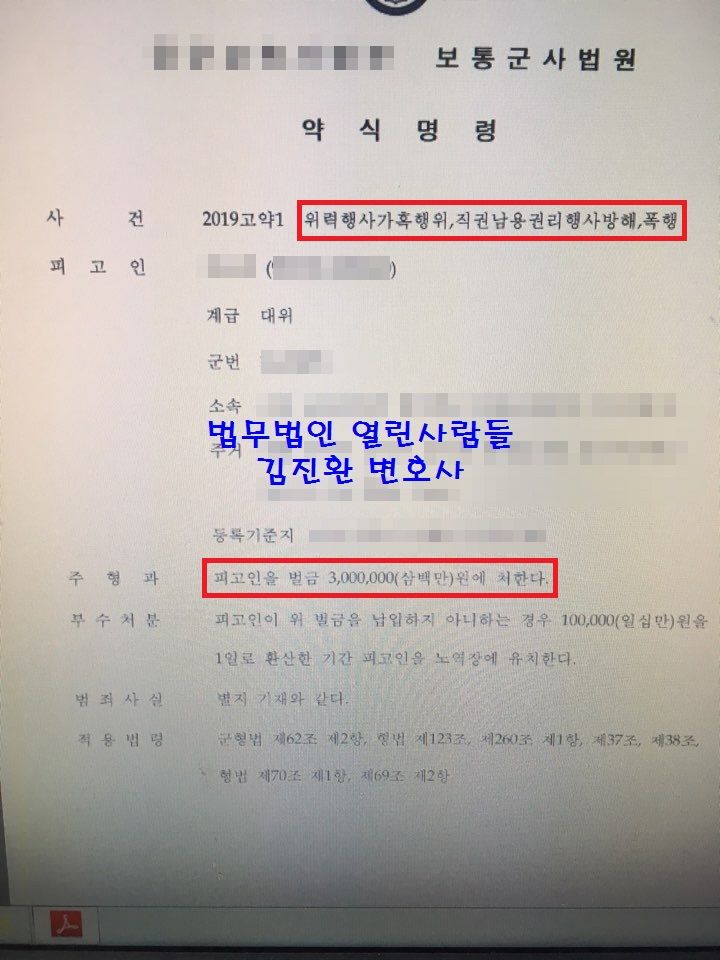 의뢰인 입장에서는 약식명령으로 마무리됨으로써 법정에서 재판을 받지 않을 수 있었고 더 중요한 점은 약식명령으로 되어 현역복무부적합심의를 받지 않게 되었다는 것이었습니다.
