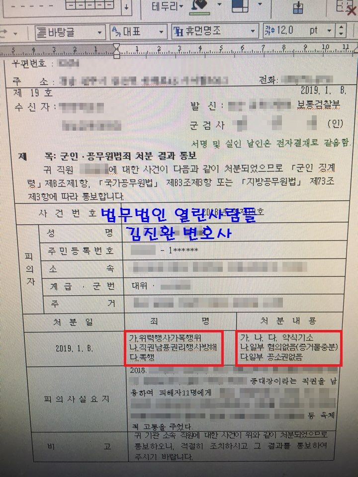 또한 일부 직권남용죄에 대하여는 범죄혐의가 인정되지 않는다며 '무혐의처분'을 해주셨고 영외에서 이루어진 폭행행위에 대하여는 피해자들과 합의를 하였다는 이유로 '공소권없음' 처분을 내려주셨습니다.