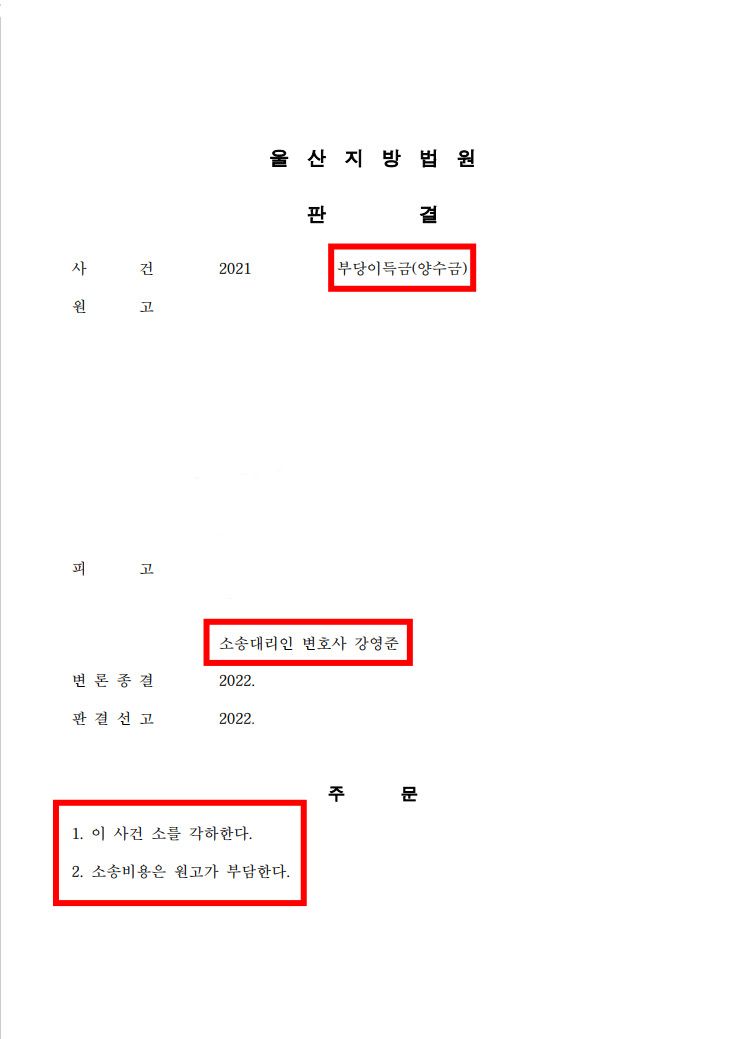 그 결과 울산지방법원에서는 이 사건 소를 각하하였고, 소송비용은 원고가 부담하라는 판결을 내렸습니다.
