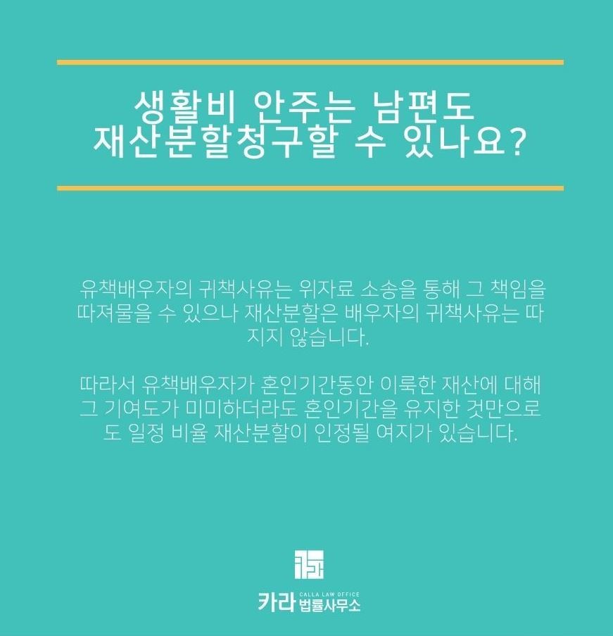 즉 유책배우자의 귀책사유는 위자료 소송을 통해 그 책임을 따져물을 수 있으나 재산분할은 배우자의 귀책사유는 따지지 않습니다.