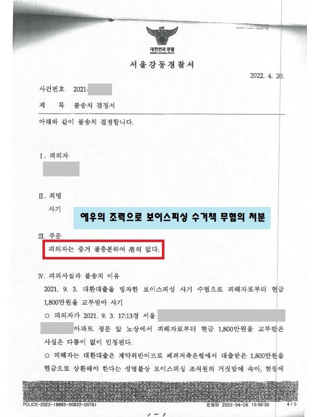 법률사무소 예우는 저희 의뢰인이 아르바이트 일을 시작하게 된 경위에 대하여 자세히 설명하면서 저희 의뢰인이 단순히 배달 아르바이트를 하는 것인 줄 알고 피해자로터 현금을 교부받았다는 점을 변호인의견서를 통해 적극 주장하였으며, 저희 의뢰인은 변호인과 동행하여 여러 차례 수사를 받은 후 결국 보이스피싱 수거책임에도 성공적으로 무혐의 처분을 받을 수 있었습니다.