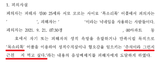 A씨는 2021. 9. 21.경 여느 때와 마찬가지로 '목소리톡'을 하던 중, "추석이라 그런지 근친 ○지 먹고 싶다"라는 '메아리'를 보냈습니다.