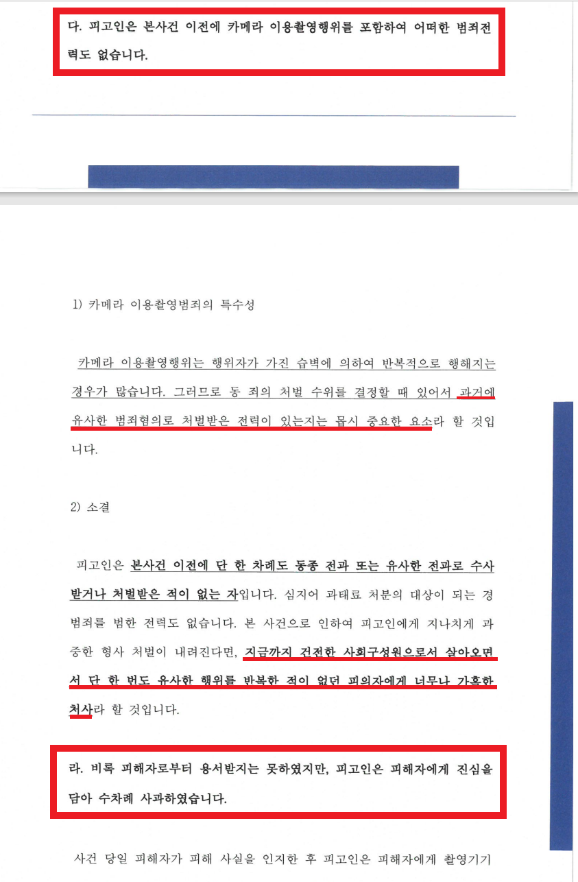② 자신의 행위에 대하여 깊이 반성하고 있으며, 다시는 카메라 이용촬영행위를 하지 않겠다고 맹세한 점