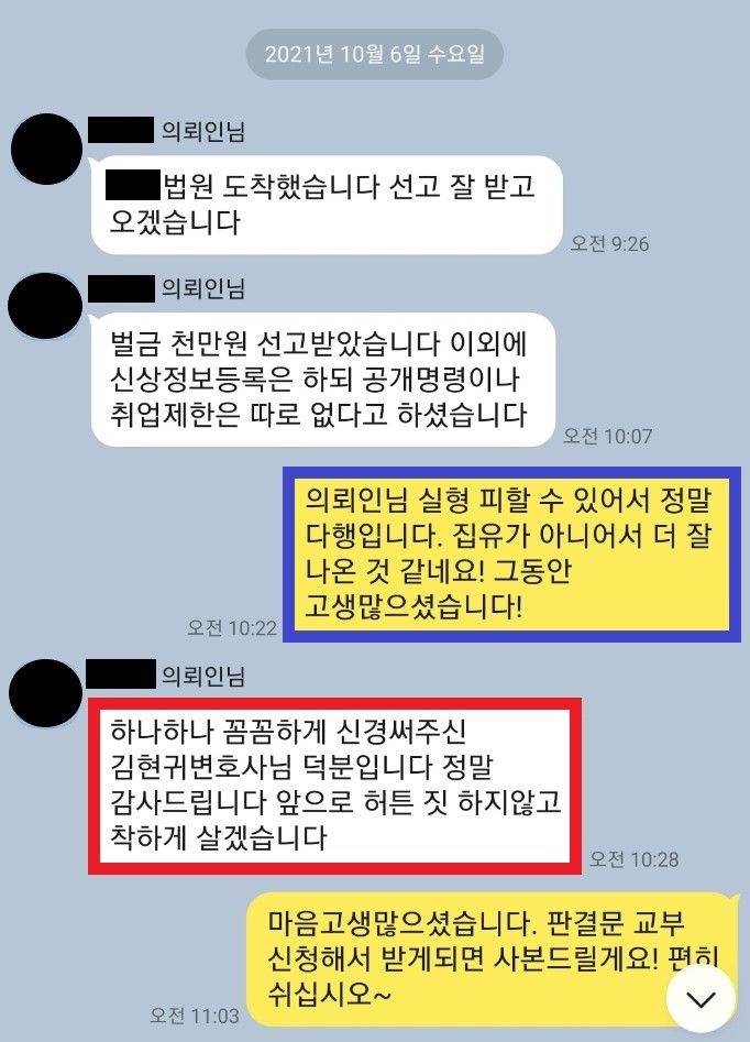 의견서를 제출한 뒤, 모든 공판 기일에 참석하여 증거인부, 인정신문, 최후 변론 과정을 통하여 적극적인 변론을 하였습니다.