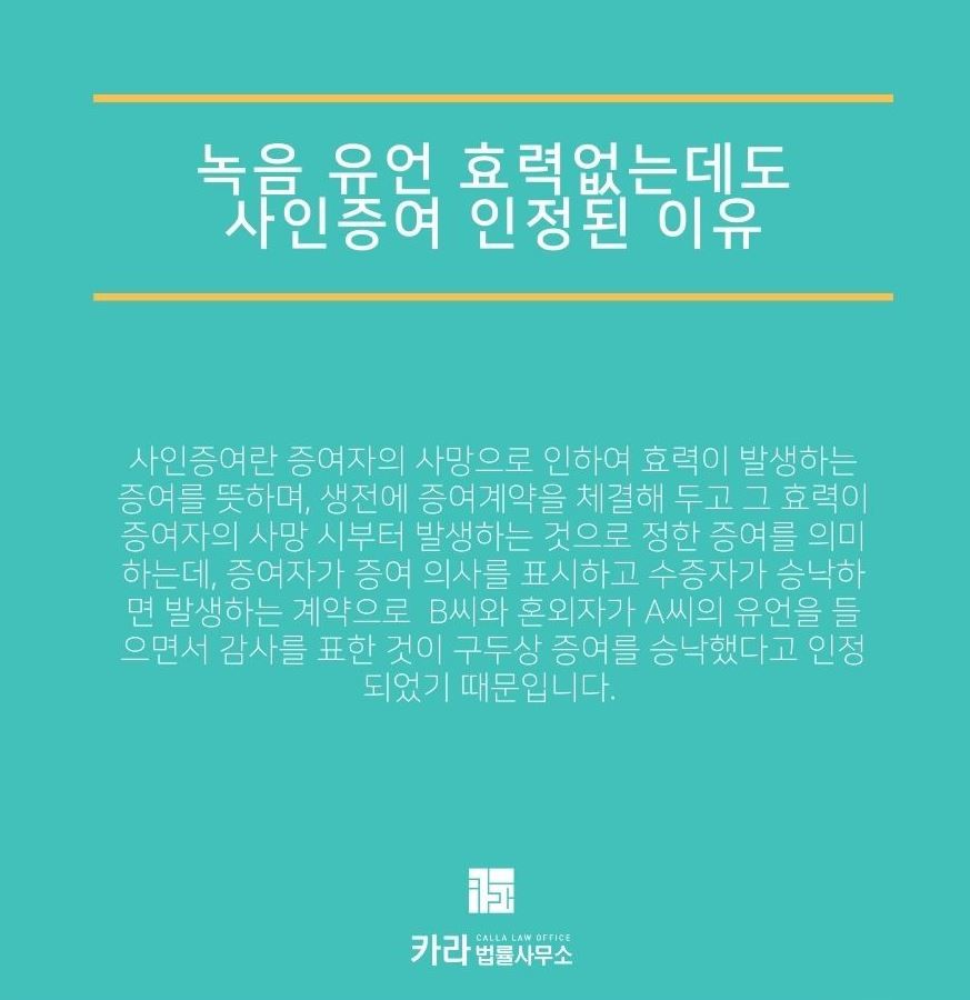 법적으로는 무효인 유언이었음에도 사인증여가 인정된 것입니다.