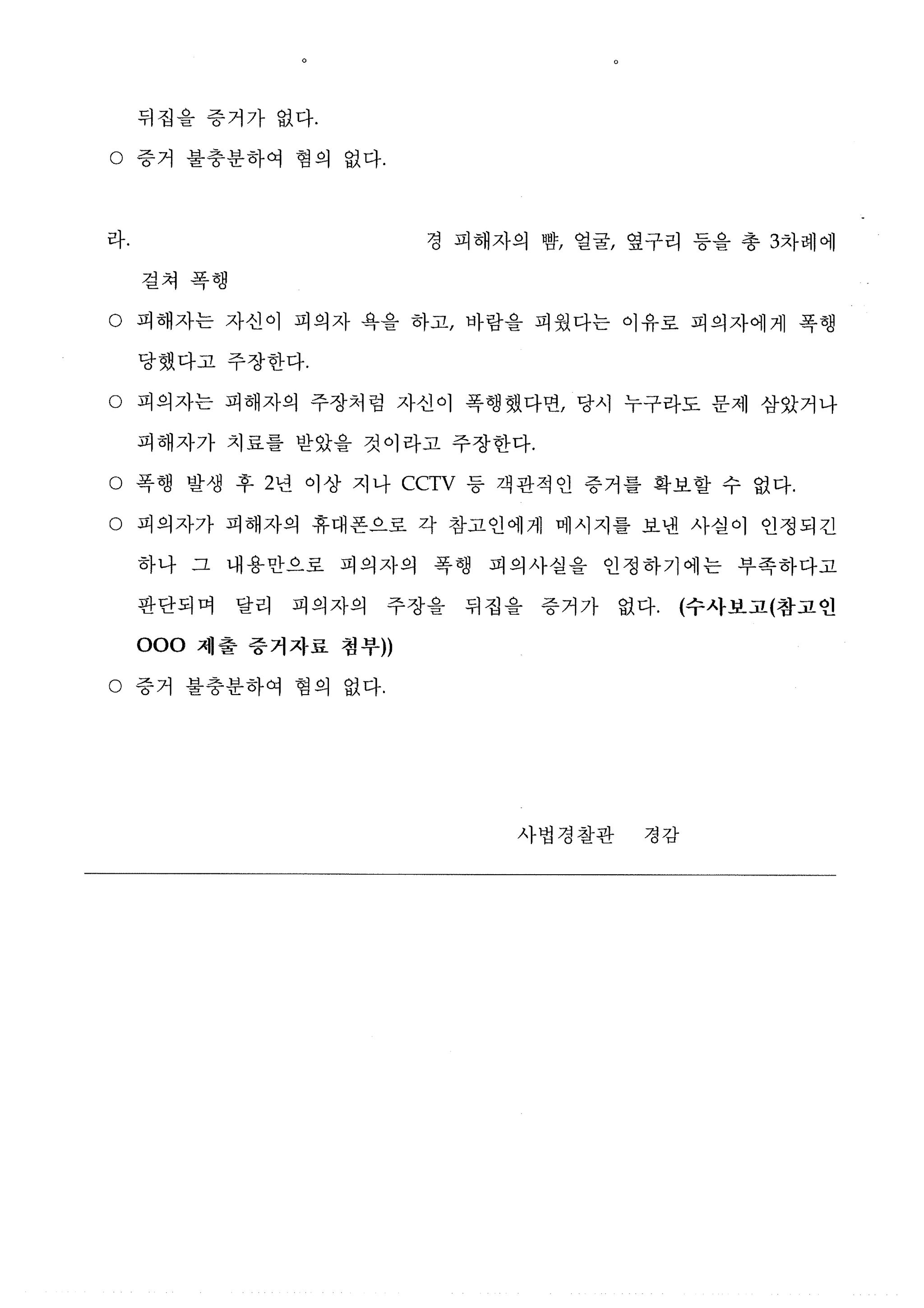 사건 이후 오히려 고소인이 피의자에게 사과를 하고 있는 대화내용은 명백히 성폭행 피해자라는 고소인의 주장과 부합하지 않는 것이고, 피의자가 고소인을 협박하여 어쩔 수 없이 만남을 지속하였다는 고소인의 주장과 정면으로 배치되는 것이었습니다. 그 외에도 인스타그램 대화 내용 등을 통해 가학적 성폭행을 당한 피해자가 가해자를 상대로 할 수 없는 말들을 특정하여 고소인 진술의 신빙성을 탄핵하였습니다.