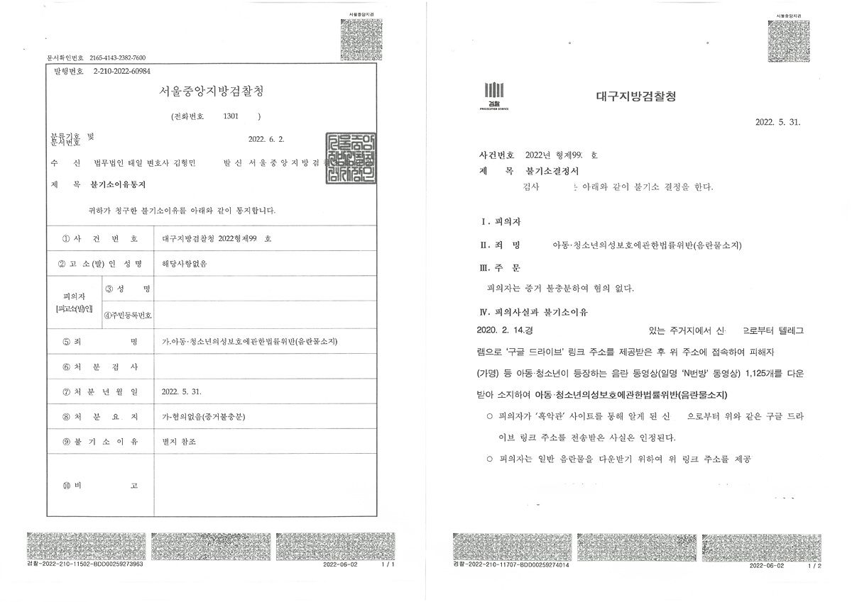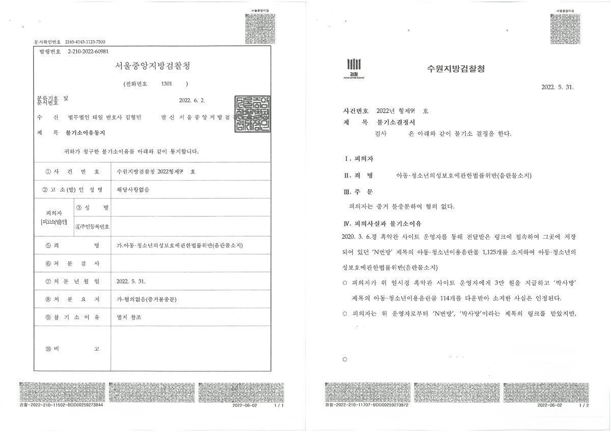 5월 31일자로 수원지검과 대구지검에서 각 한 건씩의 불기소처분을 받아 오늘 수령하였습니다.