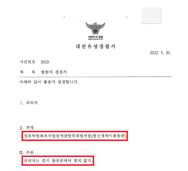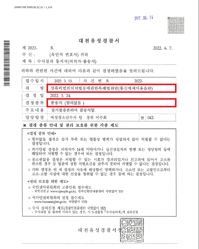 이러한 저의 조력을 바탕으로 A씨는 전혀 모르는 여성에게 다짜고짜 성적 채팅을 전송하였음에도 불구하고 '불송치(혐의없음)' 결정을 받음으로써 성범죄자가 될 위기에서 벗어날 수 있었습니다.