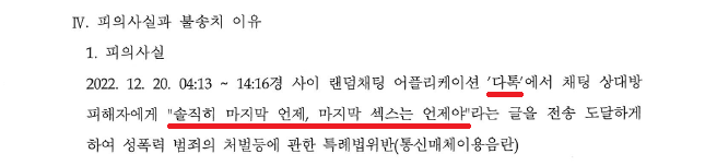 A씨는 2021. 12. 20. 새벽경 여느 때와 마찬가지로 '다톡'을 하던 중, 여성 B씨에게 다짜고짜 "솔직히 마지막 언제, 마지막 섹스는 언제야"라는 채팅을 전송하였습니다.
