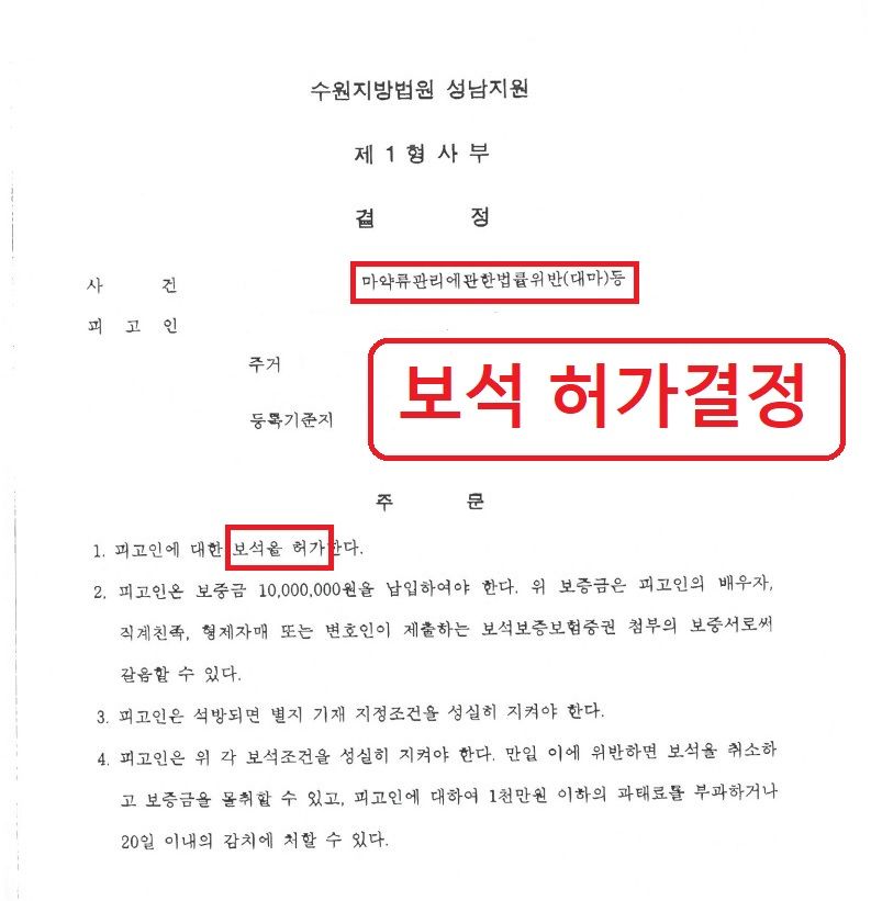 □ 의뢰인인 피고인은 마약투약과 대마소지 혐의로 형사재판이 진행중인 상황이었고, 전선재 변호사의 조력을 받아 보석허가결정을 받은 사안입니다.