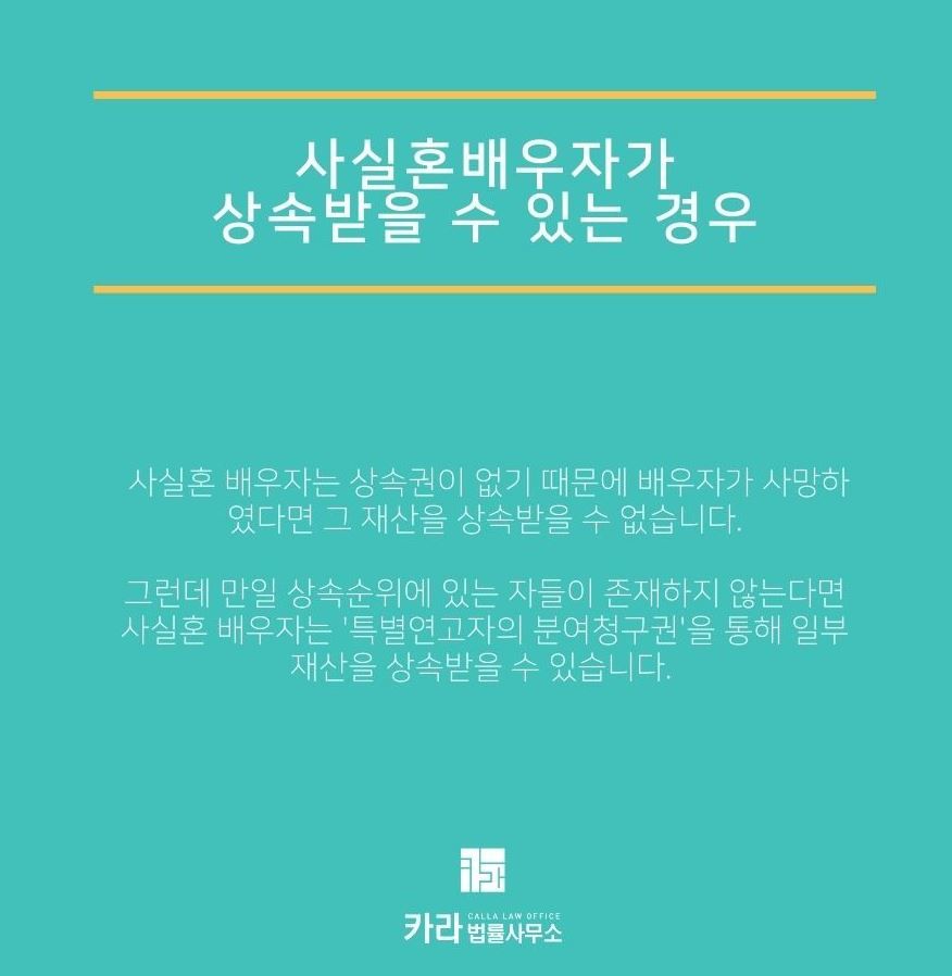 그런데 만일 상속순위에 있는 자들이 존재하지 않는다면 사실혼 배우자는 '특별연고자의 분여청구권'을 통해 일부 재산을 상속받을 수 있습니다.