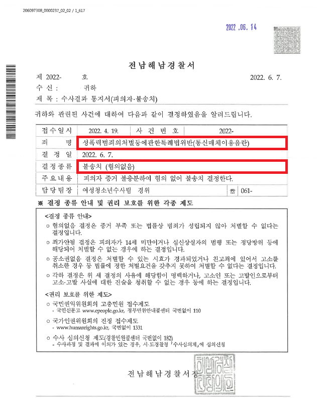 이러한 저의 조력을 바탕으로 A씨는 전혀 모르는 여성에게 다짜고짜 성기 사진을 전송하였음에도 불구하고 '불송치(혐의없음)' 결정을 받음으로써 성범죄자가 될 위기에서 벗어날 수 있었습니다.