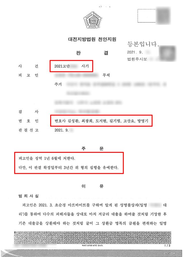 사건 주 담당 고산요 변호사는 의뢰인이 보이스피싱 수거책 역할을 구체적으로 경험하지 않고서는 범죄에 가담한 사실을 쉽게 알기 어려운 점 등을 들어 미필적 고의를 부정하였고, 정상참작 사유로 ① 의뢰인이 자신의 행동을 진심으로 반성하는 점 ② 동종 범죄의 전력이 없는 점 ③ 경제적으로 어려운 상황에서 이 사건에 가담하게 되어 참작할 만한 경위가 있는 점을 제시하며 선처를 구하였습니다.