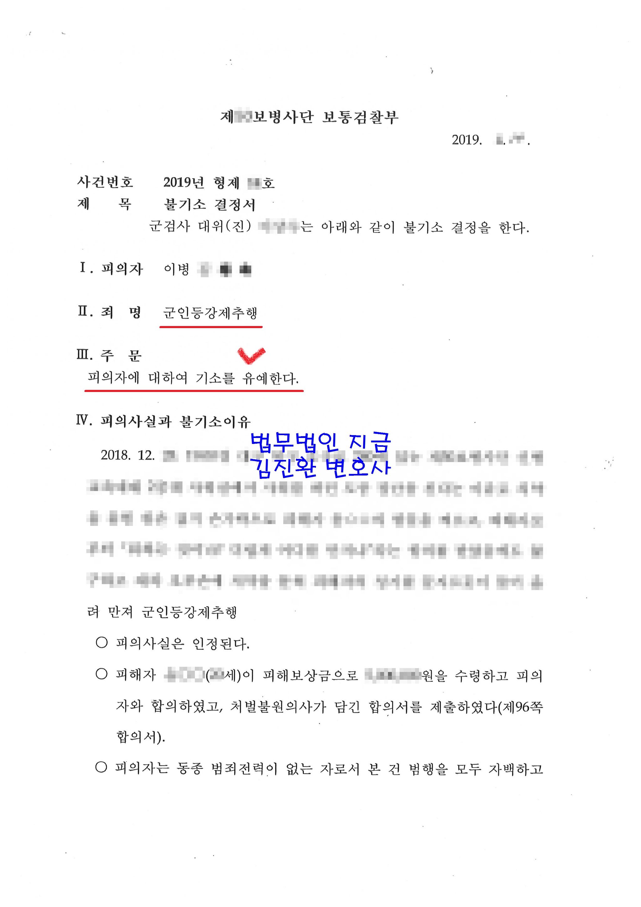 전에도 누누이 말씀드렸지만 성범죄 특히 군인등강제추행처럼 벌금형이 없고 징역형만 규정되어 있는 범죄의 경우에는 기소유예를 받는 것과 재판에 회부되는 것은 엄청난 차이가 있습니다.