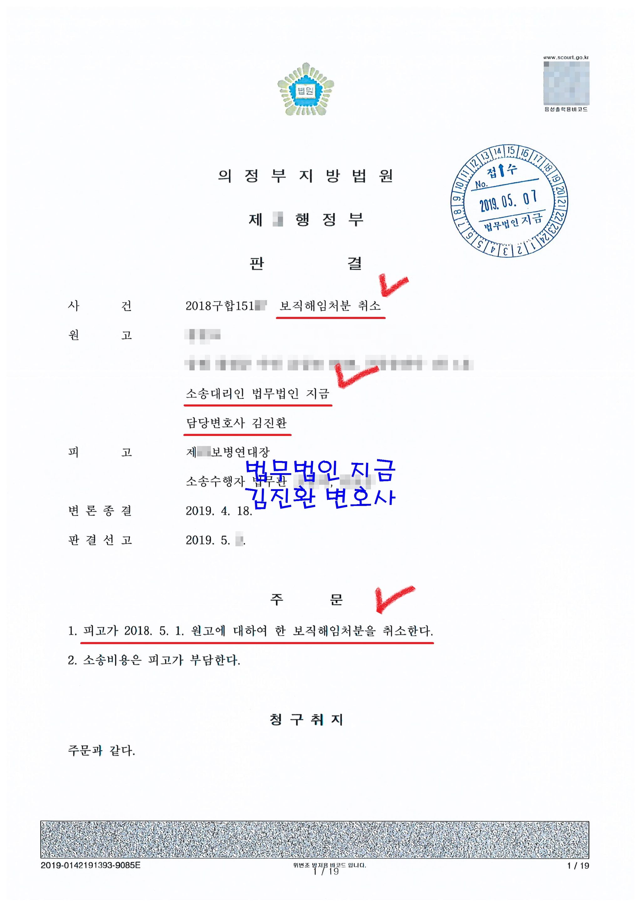 그리고 이러한 1심 판결에 대해 소송을 수행하였던 법무관도 수긍하였는지 항소를 제기하지 않아 바로 확정되었고 이로 인해 의뢰인은 인사자력표에서 '보직해임' 자력이 사라지고 보직해임 기간 동안 보직해임 당시 근무지와 보직에서 계속 근무하였던 것으로 인사자력이 수정되었습니다.