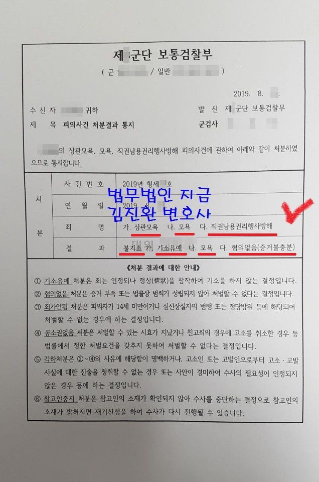 결국 적당한 합의금을 주고 여군과의 합의에 성공하였고 직권남용죄는 군검사님이 행위는 인정되지만 직권을 남용한 것까지는 안된다고 판단하여 무혐의결정을 내려주셨습니다.