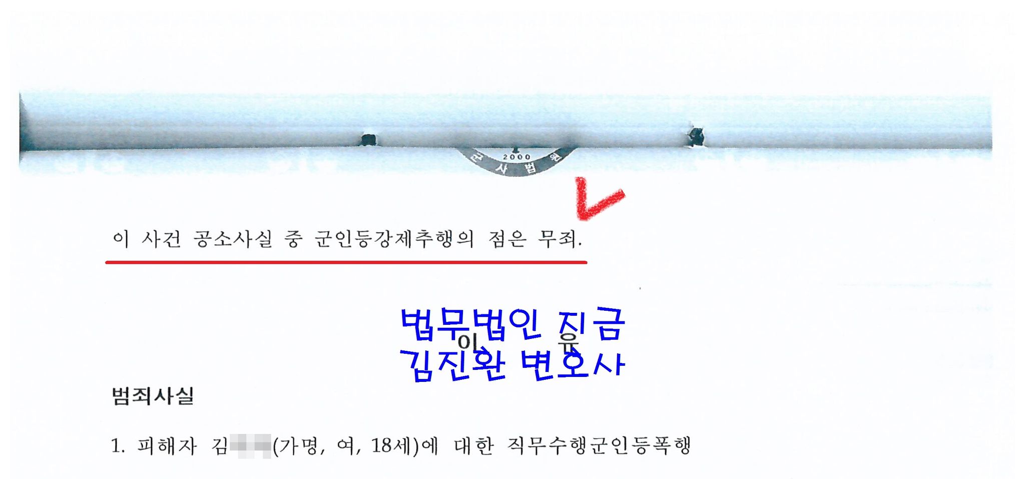 ● 보통군사법원 판결 : 벌금 700만원, 군인등강제추행 무죄, 직무수행군인등협박·일부 모욕 공소취소