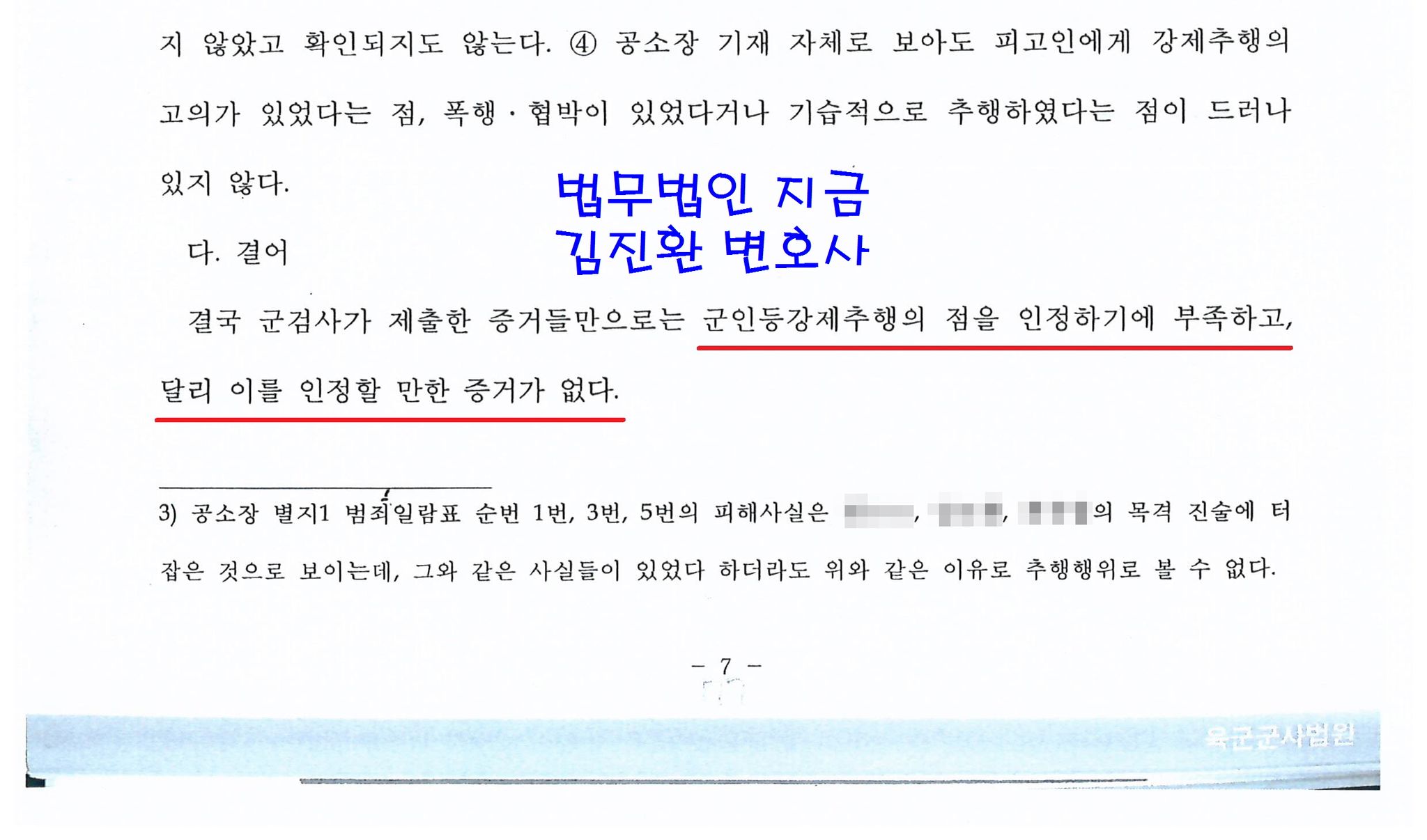 그리하여 법정에서 공소사실과 같은 행위를 한 것은 인정하면서도 법리적으로 강제추행이 성립하지 않는다고 주장을 하였고 직무수행군인등협박과 모욕 중 일부 공소사실에 대해서도 무죄를 주장하였습니다.