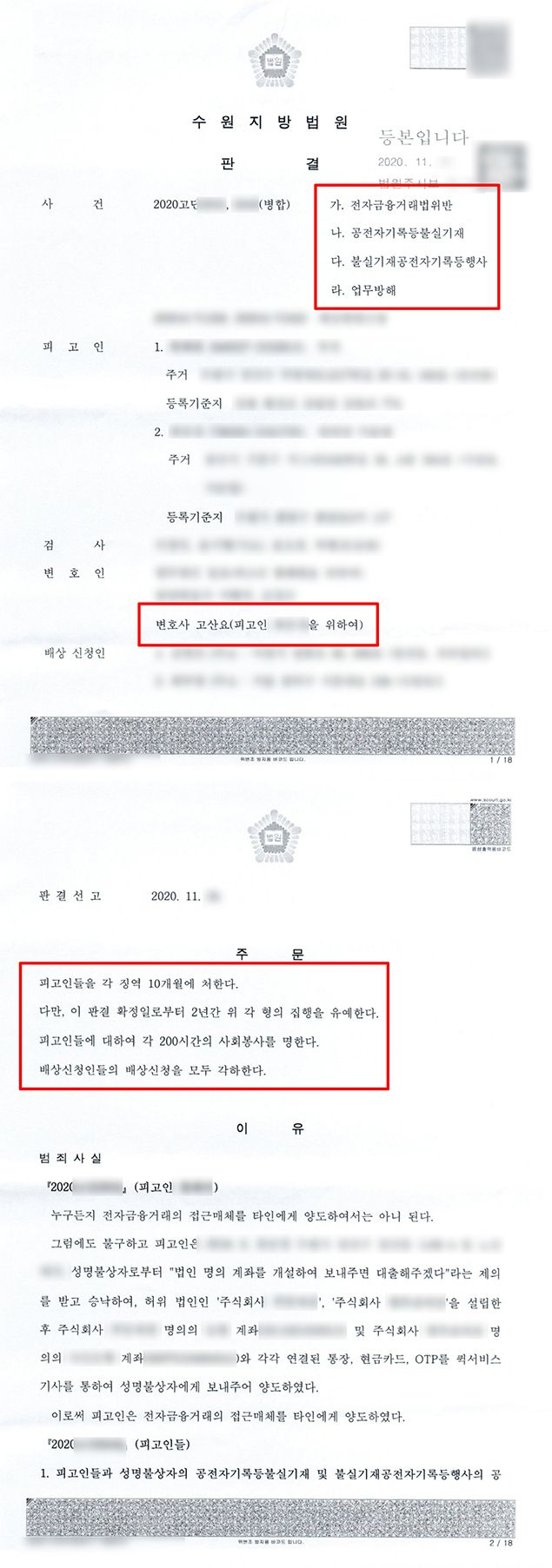 법원은 의뢰인에게 공전자기록등불실기재, 불실기재공전자기록등행사의 공소사실 중 법인등기부등부에 자본금을 제외한 나머지 사항에 대해 불실의 사실을 기록하고 이를 행사하였다는 공소사실 부분은 증명이 없음에 해당한다 하여 일부 무죄를 선고하였고, 전자금융거래법위반 및 업무방해 혐의는 인정하여 징역 10개월 및 집행유예 2년을 선고하였습니다. 의뢰인은 로진의 도움으로 실형의 위기를 극복하고 집행유예를 선고받을 수 있었습니다.