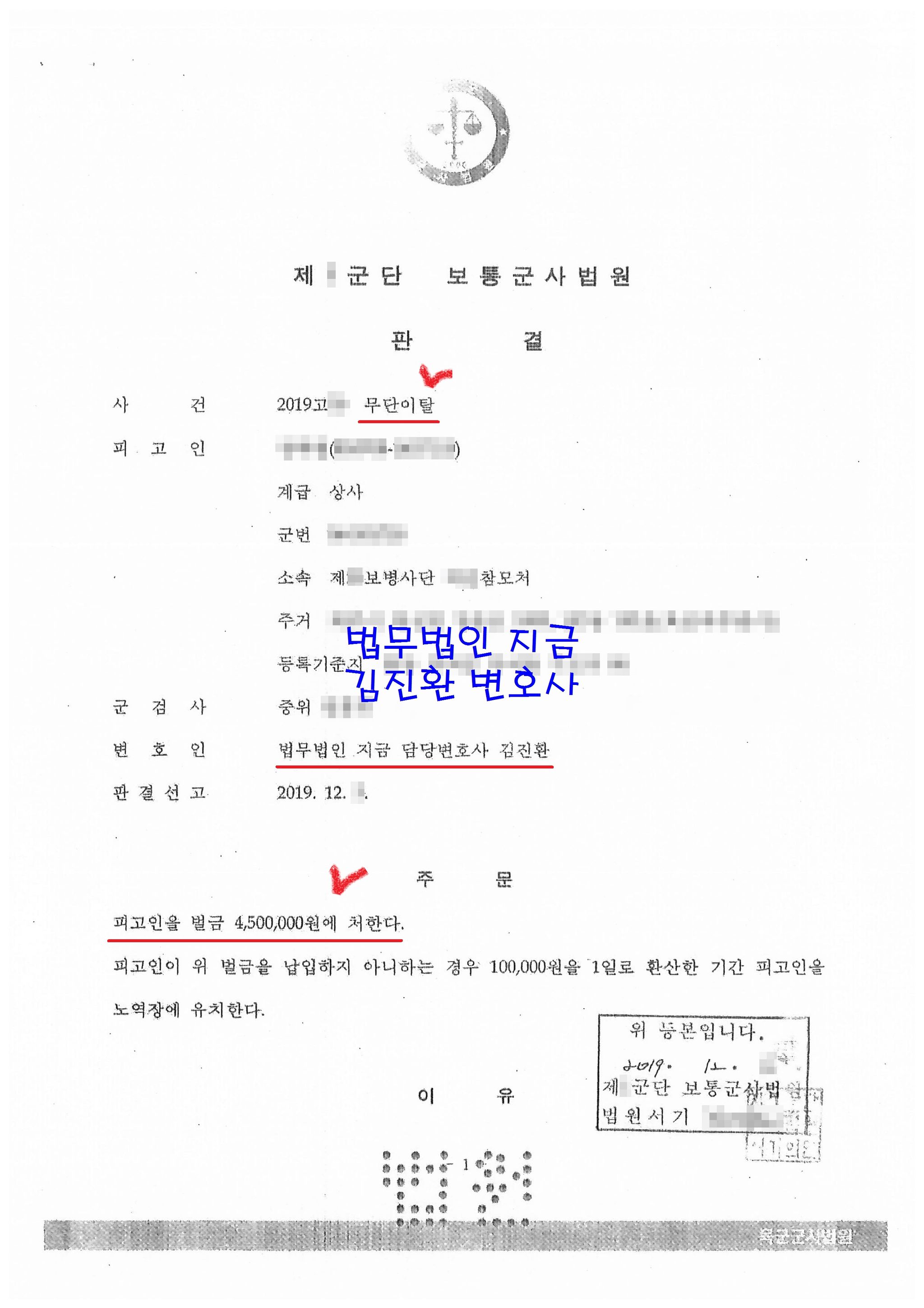 무단이탈의 법정형이 1년 이하의 금고 또는 300만원 이하의 벌금이기 때문에 벌금형을 선택하면 최대 450만원에 처할 수 있어(경합범 가중) 재판부로서는 줄 수 있는 최대한의 벌금을 부과하였습니다.