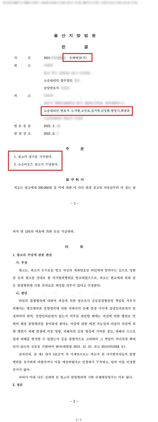 법원은 법률사무소 로진의 주장을 받아들여 원고가 제출한 증거만으로는 피고가 사기 범죄자들의 불법행위를 용이하게 하였다거나, 이를 예견하였다고 인정하기 부족하고, 달리 이를 인정할 증거가 없다며 원고의 청구를 기각하였습니다.