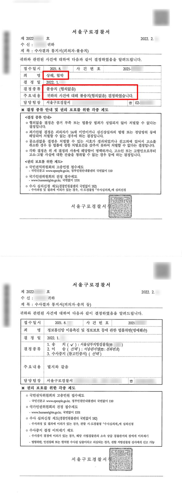 이에 경찰은 상해와 협박에 대해서는 무혐의 불송치 결정을, 명예훼손에 대해서는 혐의가 인정된다며 검찰 송치를 하였습니다. 그러나 이후 검찰은 법률사무소 로진 형사전문변호사의 의견서를 꼼꼼히 검토한 후 명예훼손의 점에 대해서도 경찰에 보완수사 요청을 한 상태입니다.