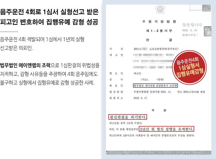 재판부는 이러한 조건명 변호사의 변론 내용들을 대부분 인정하였고, 음주전과 4회차이자 1심에서 실형을 선고받았음에도 불구하고 원심판결을 파기하고 조건명 변호사가 청구한 집행유예를 선고하는 판결을 하였습니다.