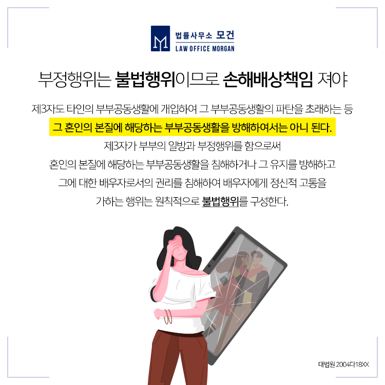법률사무소 모건의 이다슬 대표 변호사는 이혼전문변호사이자 다수의 상간녀소송에서 원고를 대리하여 고액의 위자료를 이끌어 낸 상간녀소송전문변호사입니다. 많은 외도 당사자들이 자신들의 부정행위를 회피하고 책임을 지지 않으려는 태도를 보이는 만큼, 원고 측 역시 만반의 준비로 소송에 임할 필요가 있습니다. 도움이 필요하신 분들은 법률사무소 모건으로 문의하시기 바랍니다.