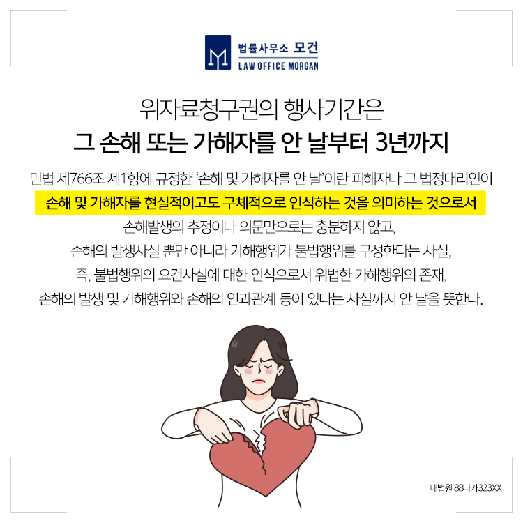 다만 '그 손해 및 가해자를 안 날'에 대한 해석은 구체적인 사안에 따라 다르며, 소멸시효에 대한 항변은 피고 측이 주장하여야만 그에 대응할 필요가 있으므로 미리 고민하시기 보다는 종로상간녀소송전문변호사를 찾아 자세한 법률도움을 구하시는 것이 바람직합니다.