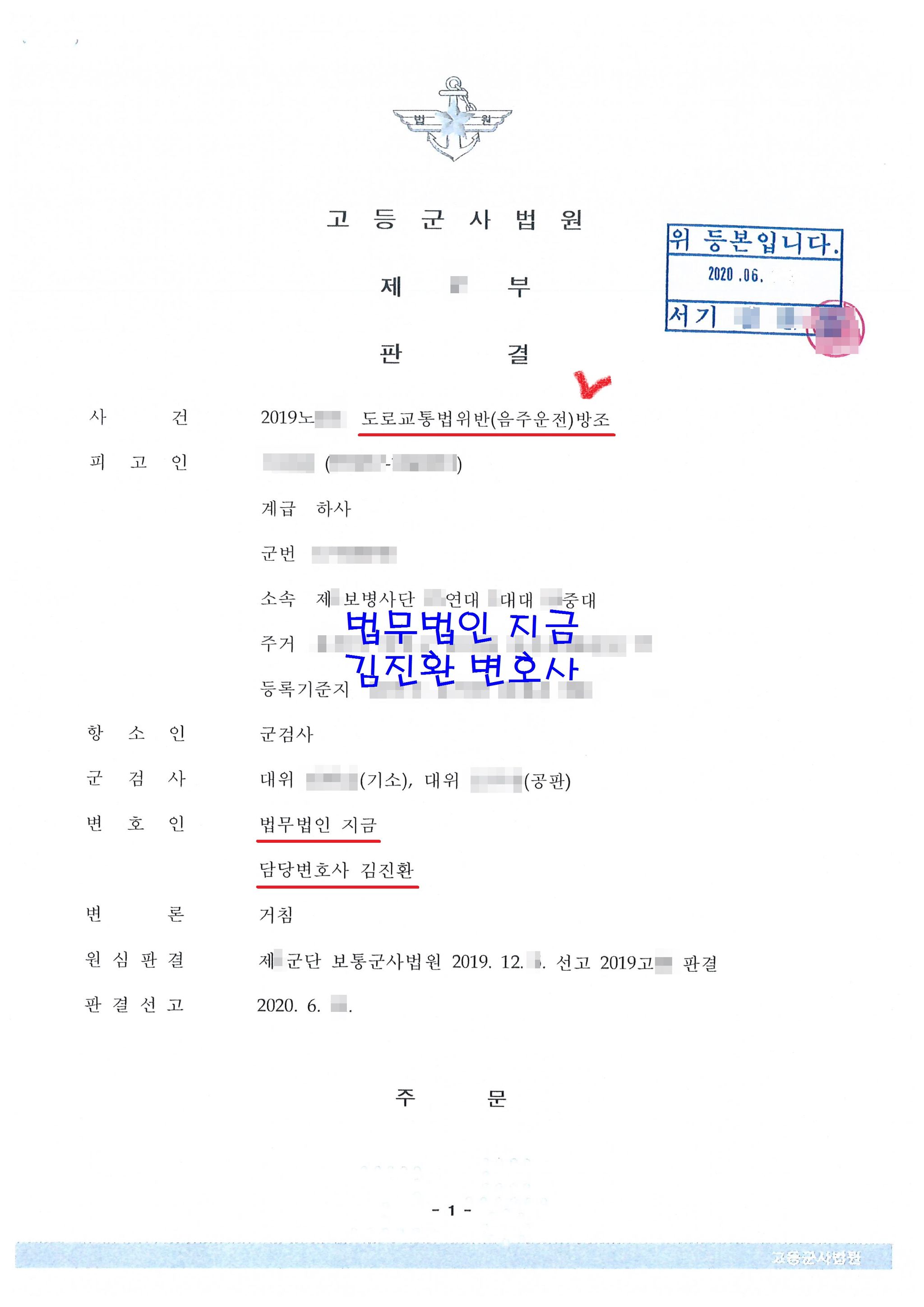 항소심에서도 계속 변호를 맡아 피고인이 운전한 병사의 직속상관은 아니어서 지휘명령 관계에는 있지 않은 점, 음주운전 당시는 공적인 업무를 하던 때가 아니고 둘 다 휴가를 나가 만난 사적인 사이에서 발생한 것인 점, 피고인이 단지 암묵적으로 음주운전 차량에 동승한 것이 아니라 해당 병사의 음주운전을 적극적으로 막으려는 시도를 하였고 단순히 음주운전 차량에 동승한 것만으로는 음주운전을 하는 데 있어 도움을 주거나 음주운전을 용이하게 한 것은 아니라는 점 등을 다시 주장하게 되었습니다.
