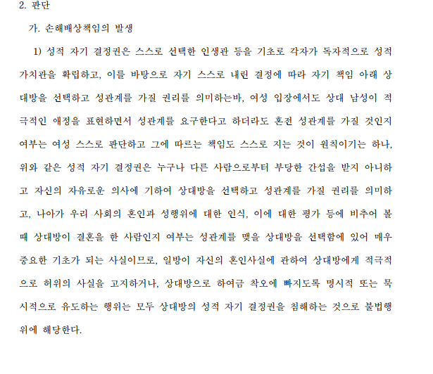 해당 사건 재판부는 피고의 성적자기결정권 침해 및 교제 당사자의 신의성실의무 위반을 지적하며 피고에게 2천만 원의 손해배상 책임을 인정했습니다. 구체적인 사안에 따라 다르지만 성적자기결정권 침해를 청구 원인으로 하여 피고에게 상당한 손해배상책임을 인정한 사례입니다.