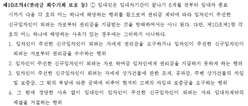 다만 이 경우에도 임대인이 임차인에게 권리금을 무조건 지불해준다는 것이 아니라, 임차인이 권리금을 받을 기회를 방해하지 않아야 하는 것에 불과하므로, 임차인으로서는 계약 종료 6개월 전부터 임대차 종료시까지 권리금을 지불하려는 신규임차인을 반드시 구해야만 합니다.