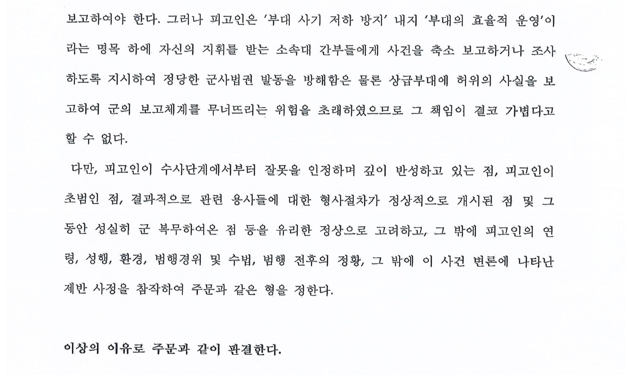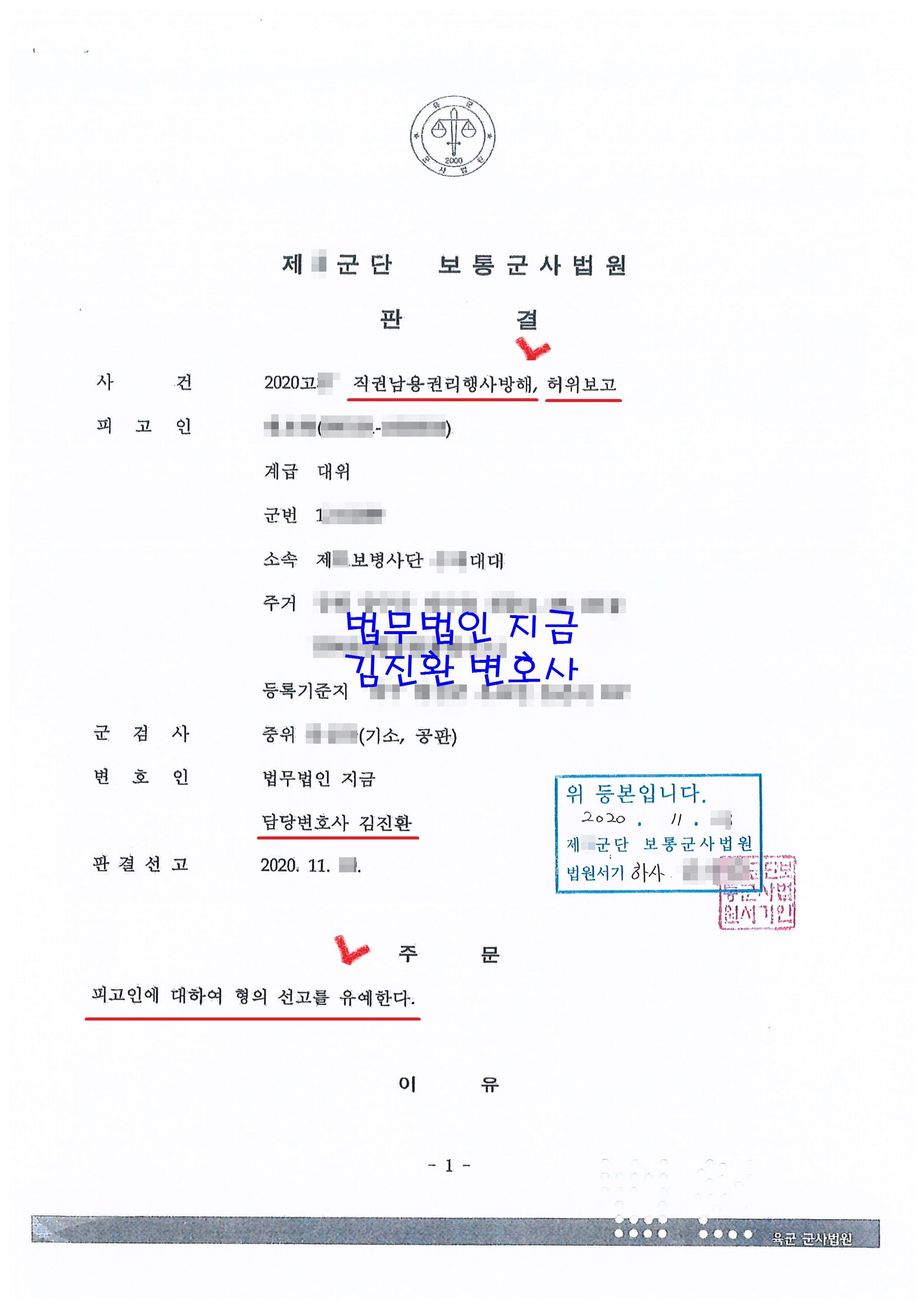 군형법 상의 "허위보고죄"가 벌금형이 없고 징역형만 규정되어 있어 일반적으로는 집행유예 이상의 판결이 나오는 것이 보통이나 재판부에서 군복무를 계속 이어갈 수 있도록 특별히 선처를 해주셨습니다.