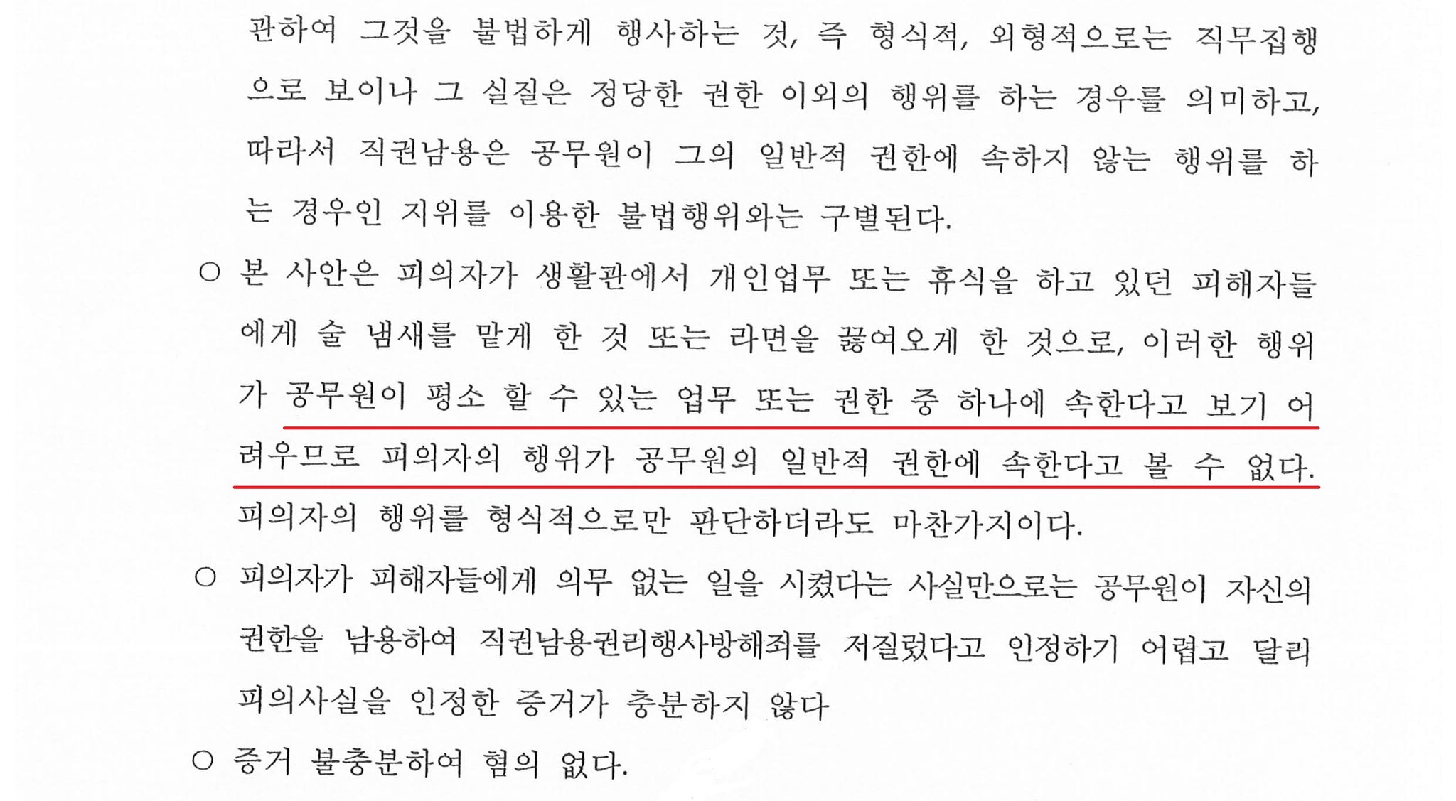 직권남용권리행사방해죄는 공무원이 직권을 남용하여 타인에게 의무 없는 일을 시키거나 권리행사를 방해하는 죄인데 아무리 지휘관이라고 하더라도 병사들에게 술냄새를 맡도록 하거나 라면을 끓여오게 하는 것은 공무원의 업무나 권한 범위 내에 속하는 일이 아니라고 판단한 것이었습니다.